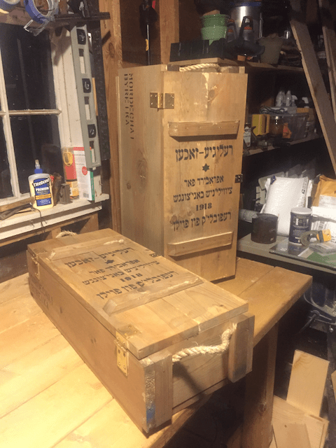 I’m a big fan of Larry Coreia’s urban fantasy “Monster Hunter International.” One of the minor characters is a Jewish monster hunter named Mordechai Byreika, who was born in Poland and died during WWII. I had fun imaging that these were his gear boxes. I modeled them after vintage ammunition boxes. The front stencil reads, in Yiddish, “Religious Items. For Non-military use. Republic of Poland 1918.”
