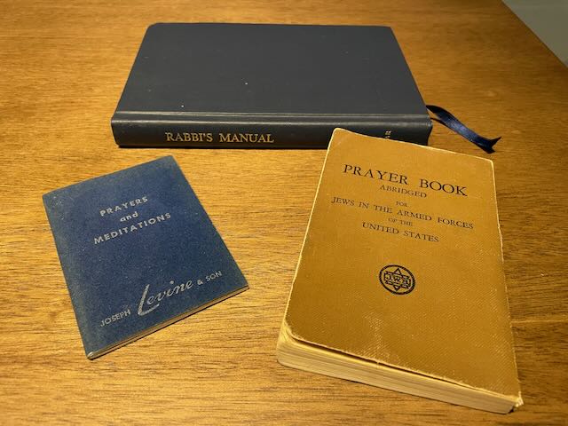 Prayer books. Got to be ready for anything. I carry a vintage US Army Jewish prayerbook, a rabbi’s manual, and small “Prayers and Meditations” for funeral usage. Not in this picture, but I also have a couple of tahara manuals (preparation of the dead for burial).